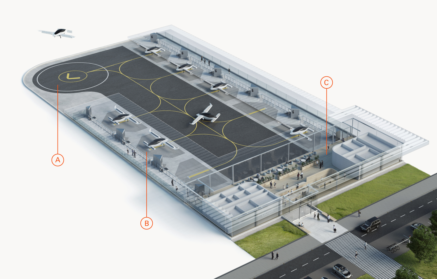 (A) Landing Pad**: For eVTOL takeoffs and landings.